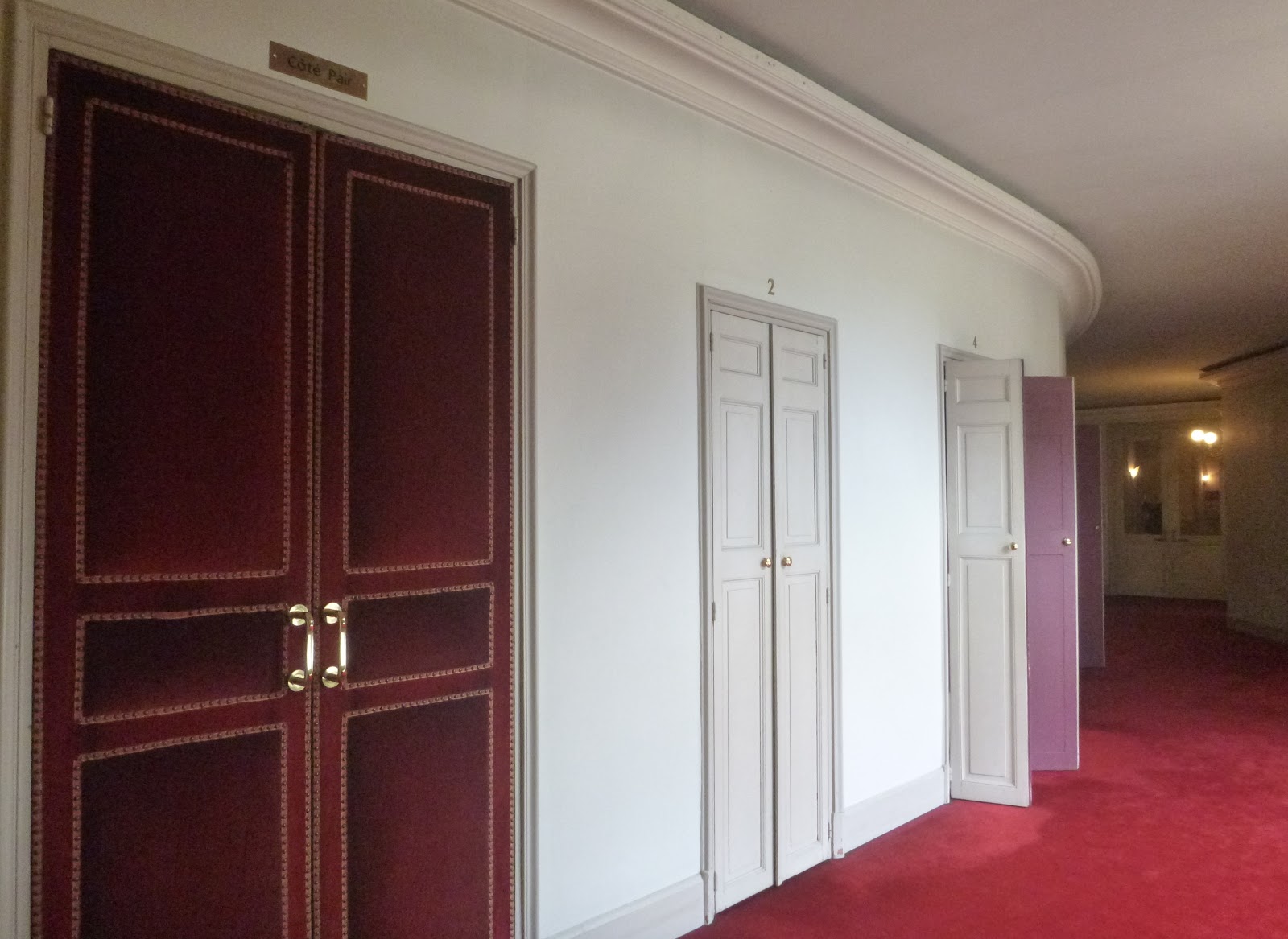 Cette parenthèse achevée, n'hésitez pas à arpenter les différentes parties de la salle : on voit bien les différence de largeur de rangées entre le parterre ou les galeries, les positions habituelles des spectateurs qui s'appuient sur le velours rouge...
